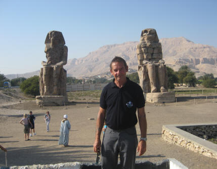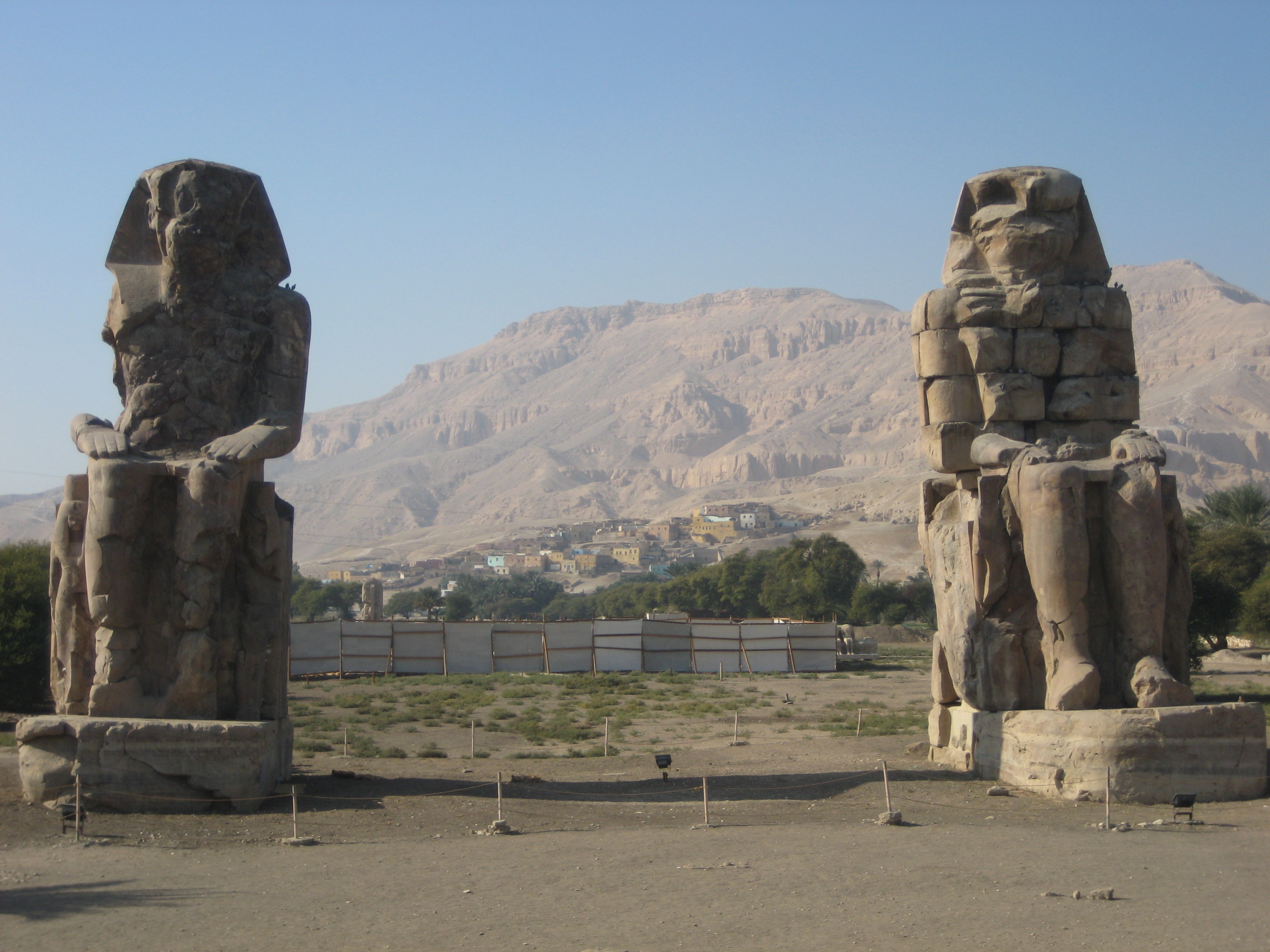 Perhaps the most imposing monument on the West Bank at Luxor are the famous 'Colossi of Memnon'. The statues are made from blocks of quartzite sandstone quarried at el-Gabal el-Ahmar (near modern-day Cairo). They are estimated to weigh around 700 tons each and were transported 420 miles overland to Thebes. (They are too heavy to have been transported upstream on the Nile.) Standing 18 metres (60 feet) high, these two statues depict Amenhotep III in a seated position with his hands on his knees and once flanked the entrance to his temple. In it's day, this temple complex was the largest and most opulent in Egypt. Even the temple of Karnak, at that time, was smaller. The statues now stand virtually alone in a field at the side of the road to the Valley of the Kings.